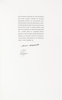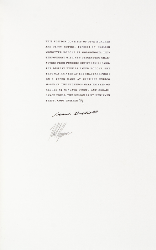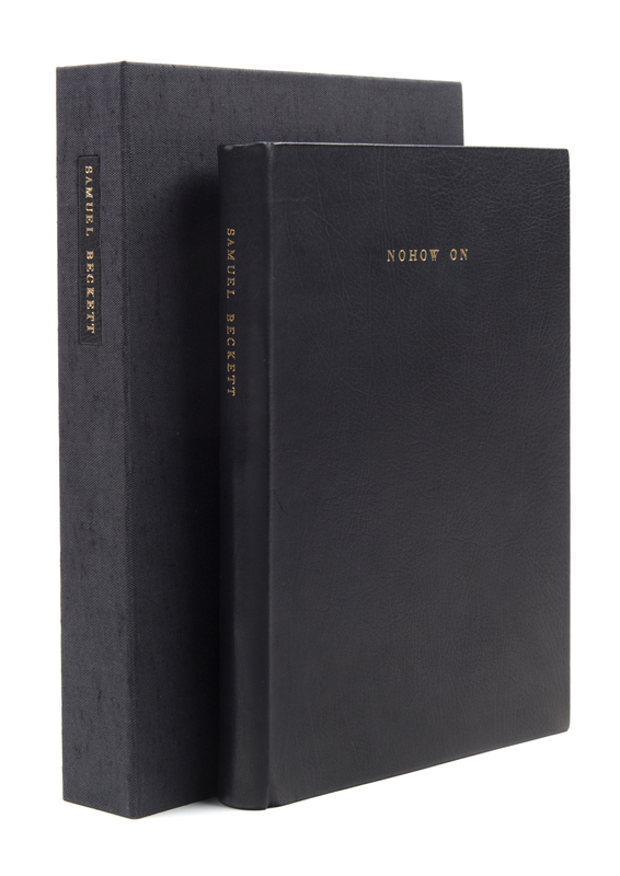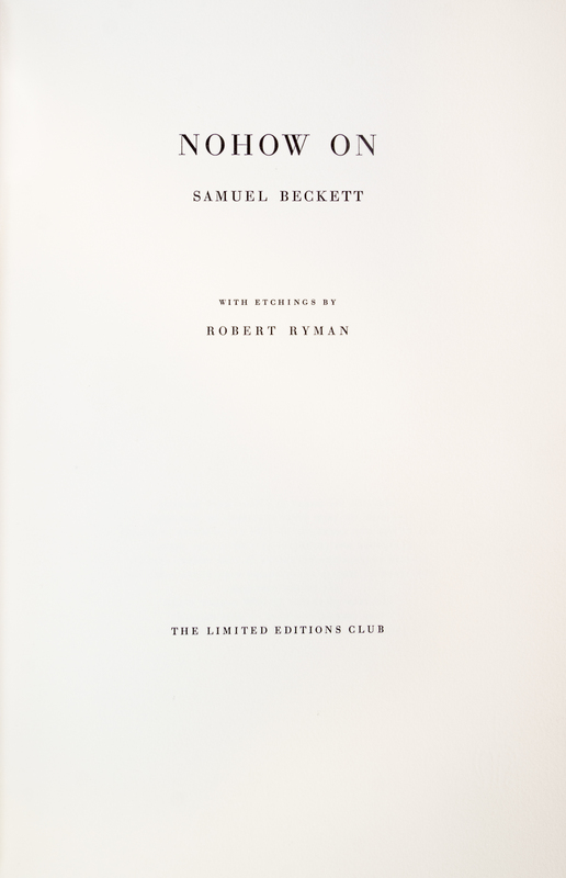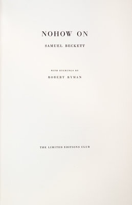 Nohow On. [New York:] The Limited Editions Club, (1989).4to, bound by Markey and Asplund in gilt-lettered navy morocco, gilt-lettered spine. Housed in custom suede-lined black cloth clamshell case, gilt-lettered morocco spine label. Illustrated with etchings by Robert Ryman. Limited edition, number 314 of 550 copies printed on Cartiere Enrico Magnani paper by the Shagbark Press, signed by the author and illustrator. Fine.