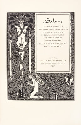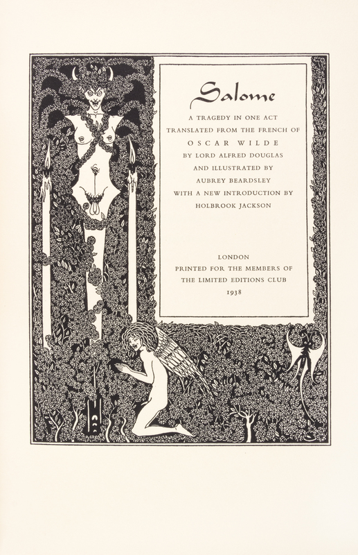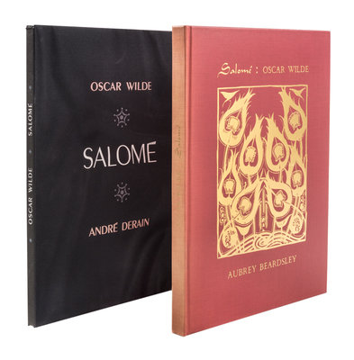 Salome. A Tragedy in One Act. London: Limited Editions Club, 1938.2 vols. Small 4to, original gilt-stamped red cloth (vol. 1) and original black printed wrappers (vol. 1). Housed in original maroon cloth slipcase. Vol. 1 with English text, translated by Lord Alfred Douglas, with 16 illustrations by Aubrey Beardsley. Number 215 of 1,500 copies. Vol. 2 with French text and 10 pochoir plates on black paper after gouaches by Andre Derain. Number 215 of 1,500 copies, signed by Derain on the limitation page. Fading and wear to slipcase at edges.