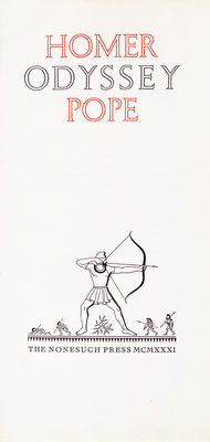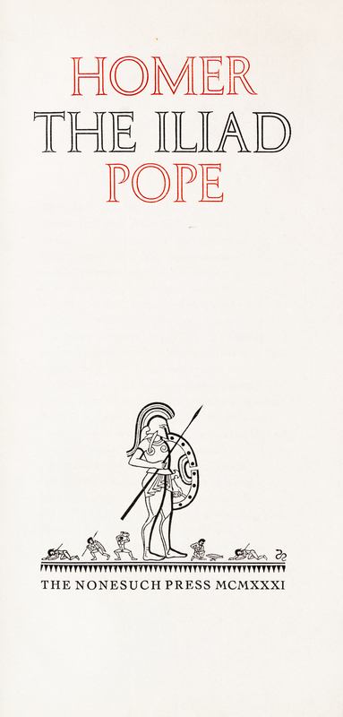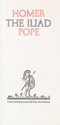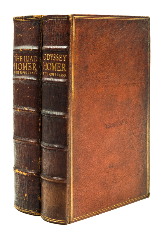 The Iliad [and] The Odyssey. Translated into English by Alexander Pope with parallel text in Greek. New York: Nonesuch Press, 1931. 2 vols. 8vo, full goatskin, gilt-lettered spines, marbled endpapers, t.e.g. Ornaments by Rudolf Koch and Fritz Kredel. Limited to 1,450 copies, these being copy numbers 480 (Odyssey) and 1261 (Iliad). Darkening to spines and edges of boards; Rubbing to raised bands and wear to hinges (Iliad); some spotting to endpapers.