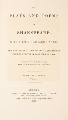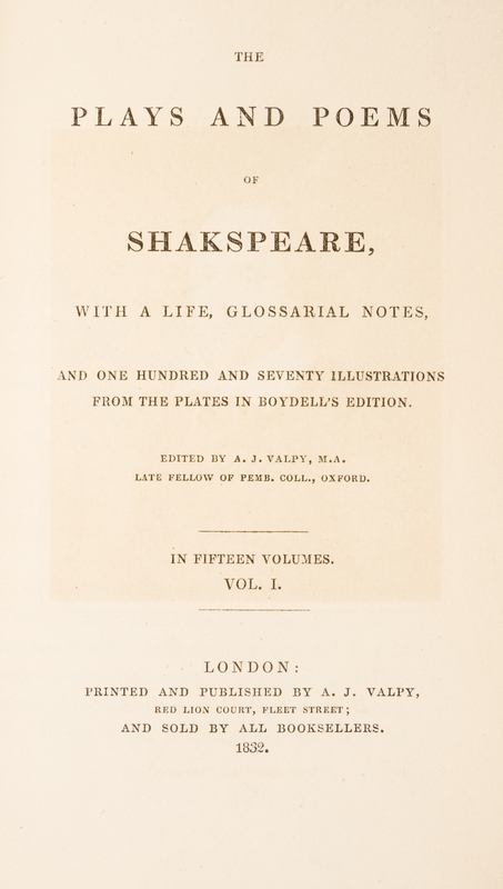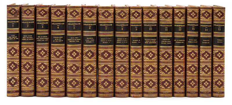 The Plays and Poems of Shakespeare, with a Life, Glossarial Notes... London: A.J. Valpy, 1832-1834.15 vols. Small 8vo, bound by Zaehnsdorf in full maroon calf, gilt-ruled boards, gilt-tooled and -lettered spines, navy morocco spine labels, gilt-inner dentelles, t.e.g. Minor edgewear; offsetting from frontispiece.