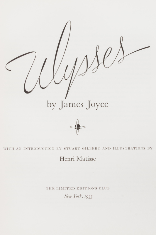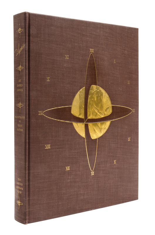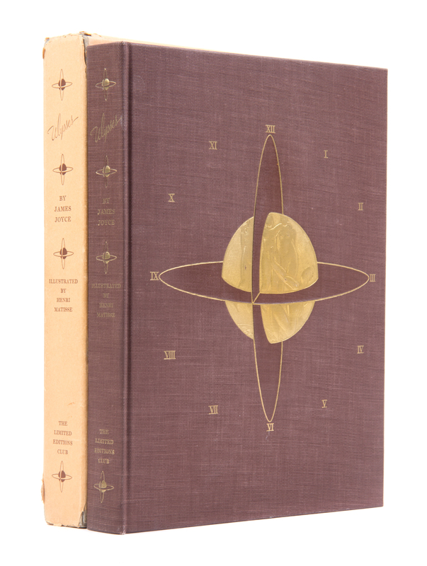 Ulysses. New York: Limited Editions Club, 1935.4to, publisher's brown buckram gilt-stamped with bas-relief design by LeRoy Appleton to front board. Housed in publisher's light orange slipcase. Number 29 of 1,500 copies printed for Limited Editions Club members and signed by Matisse on the limitation page. With 20 lithographed and etched plates after drawings by Matisse. Light soiling and wear to slipcase; otherwise fine.