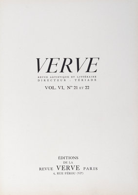 Verve. Revue artistique et litteraire. Paris: Editions Verve, [1948]Vol. VI, no. 21/22. 4to, pictorial boards, glassine. Some chipping to glassine; otherwise fine.