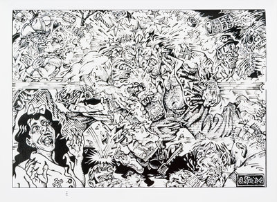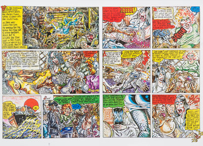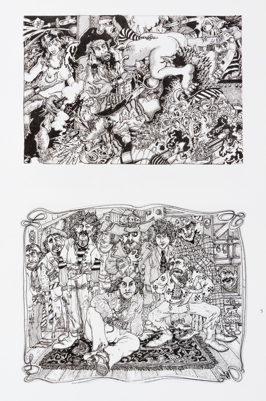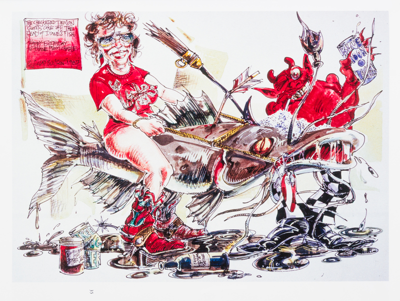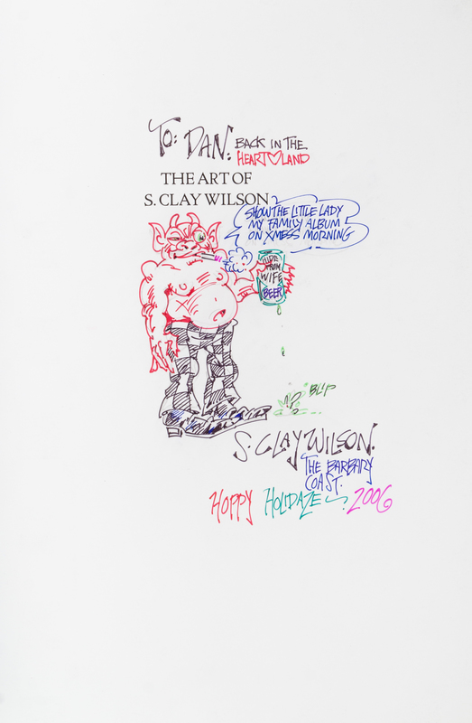 The Art of S. Clay Wilson. Berkeley: Ten Speed Press, [2006]4to, publisher's printed red cloth, dust jacket. First edition. Inscribed and signed on the half-title with original color pen illustration of Wilson's famous character the Checkered Demon. Light edgewear; some rubbing to jacket.