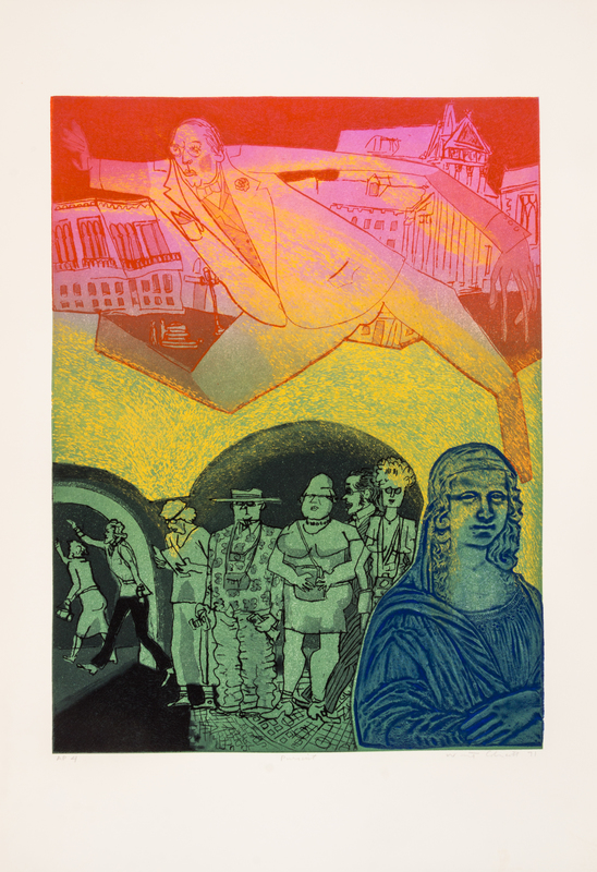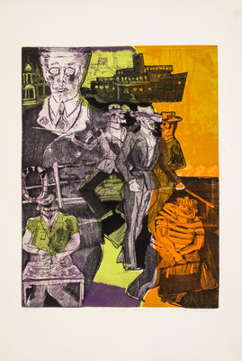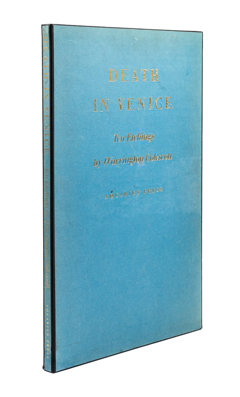 Death in Venice. Ten Etchings by Warrington Colescott. Baltimore and New York: Aquarius Press, 1971.Folio, contents loose as issued in gilt-lettered blue paper-covered clamshell folding case. Limited edition, copy AP4 of only 10 portfolios designated as Artist's Proofs. Complete with 10 color etchings, each signed, titled, and dated by Colescott in pencil, together with a copy of Thomas Mann's Death in Venice printed by Alfred Knopf in New York, 1965. Light wear and fading to slipcase; otherwise fine.