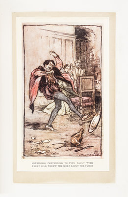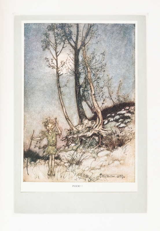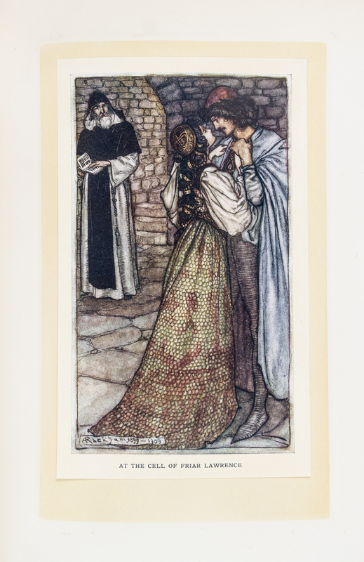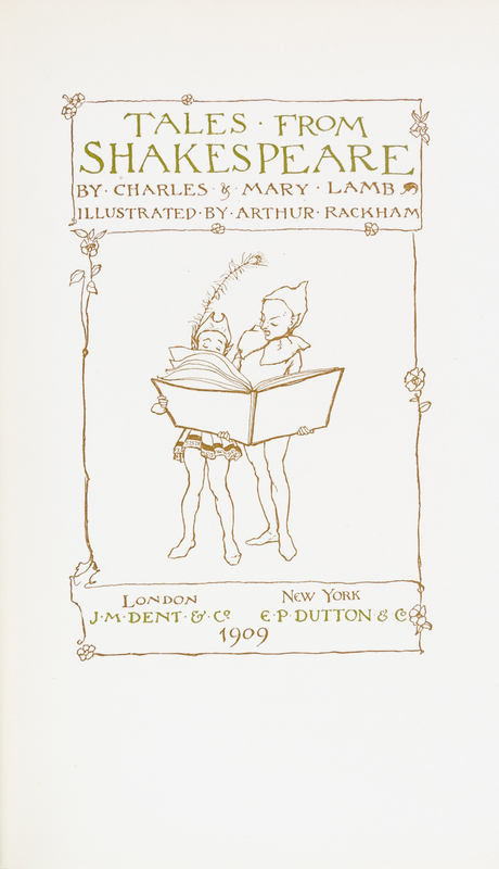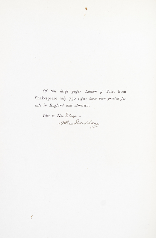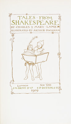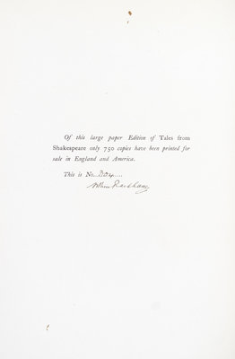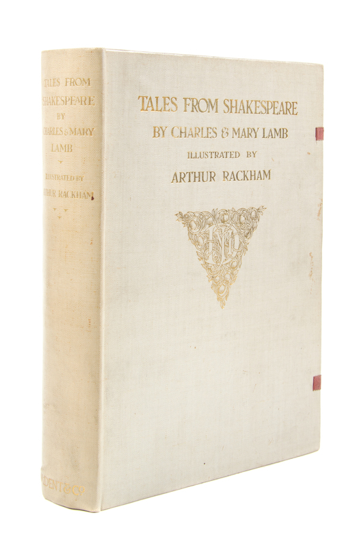 Tales from Shakespeare. London: J.M. Dent, 1909.4to, gilt-stamped and -lettered vellum, cloth ties, t.e.g. Large paper edition copy, number 304 of 750 copies, signed by Rackham on the limitation page. Illustrated with 13 mounted color plates after Rackham. Some soiling to boards; light toning to edges of most leaves;