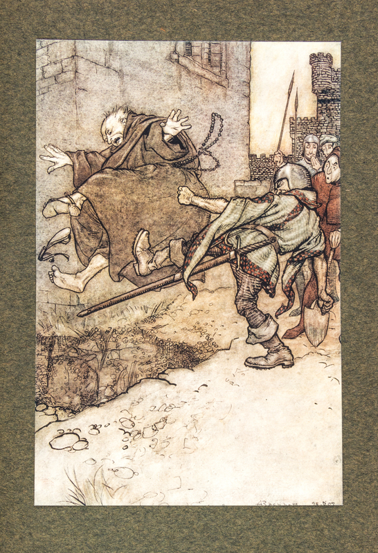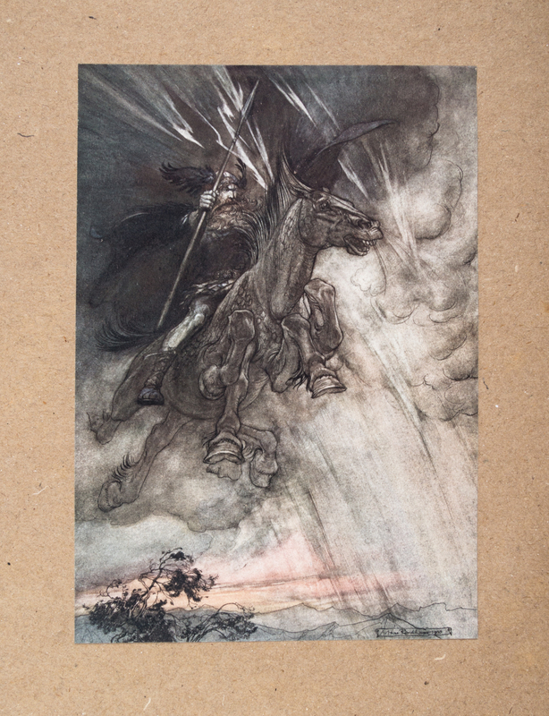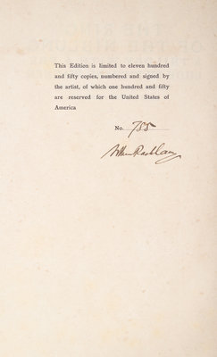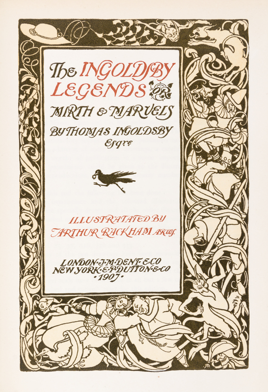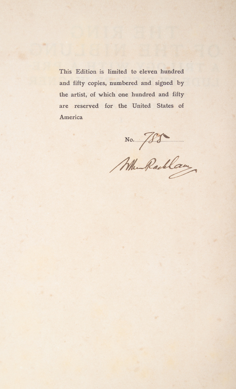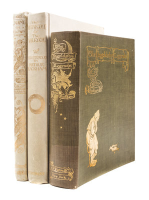 Undine. By De La Motte Fouque. London: William Heinemann, 1909. 4to, full gilt-stamped and -lettered vellum, string tie, t.e.g. slipcase. Number 707 of 1,000 copies signed by Rackham. Illustrated with numerous mounted color plates after Rackham. Light soiling to boards, slipcase broken.[Together with:] The Rhinegold & the Valkyrie. By Richard Wagner. London: William Heinemann, 1910. 4to, full gilt-stamped and -lettered vellum, t.e.g. string tie, slipcase. Number 786 of 1,150 copies signed by Rackham. Illustrated with numerous mounted color plates after Rackham. Light soiling to boards, slipcase broken. The Ingoldsby Legends of Mirth & Marvels. London: J.M. Dent, 1907. 4to, gilt-stamped and -lettered green buckram, dust jacket. With numerous mounted color plates. Jacket deteriorated; toning to leaves.