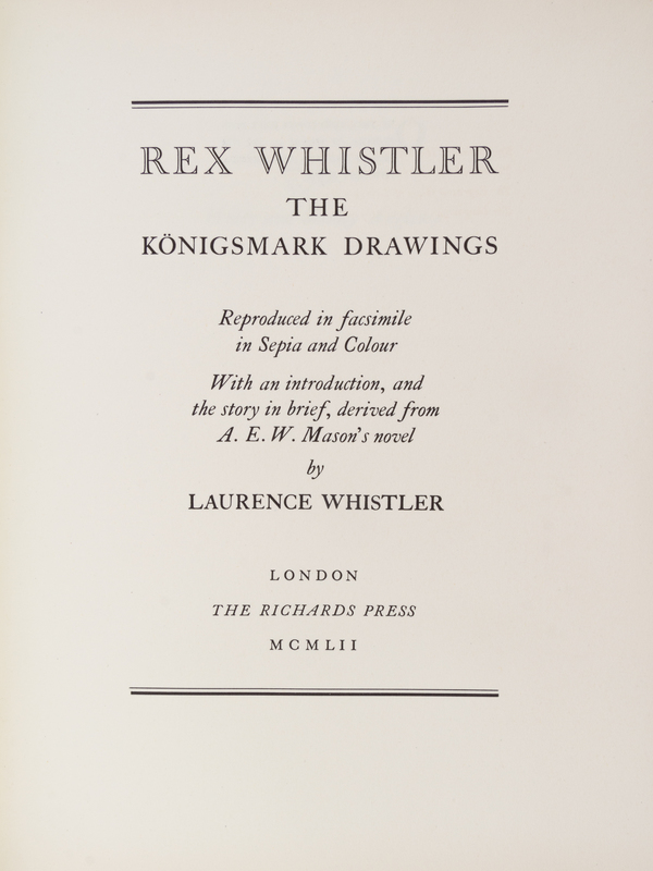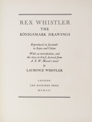 A collection of works illustrated by Rex Whistler, comprising The Last of Uptake, (2 copies) The Konigsmark Drawings, Fairy Tales by Hans Christian Anderson, (3 copies), Green Outside, The Emperor Heart, and Family, Friendships, Landscapes/Love and War. With a biography of Whistler by Laurence Whistler.