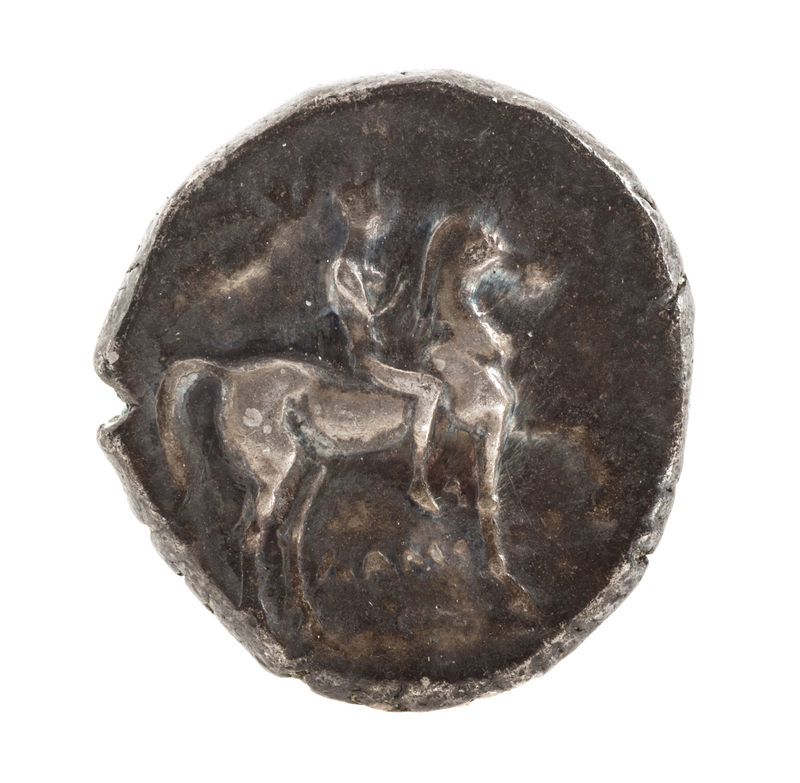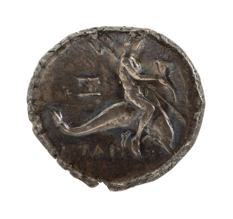 Featuring Taras upon a dolphin on obverse, rider on horseback on reverse.