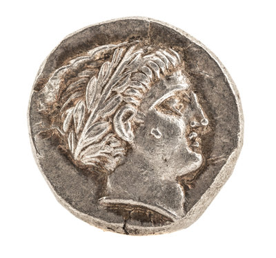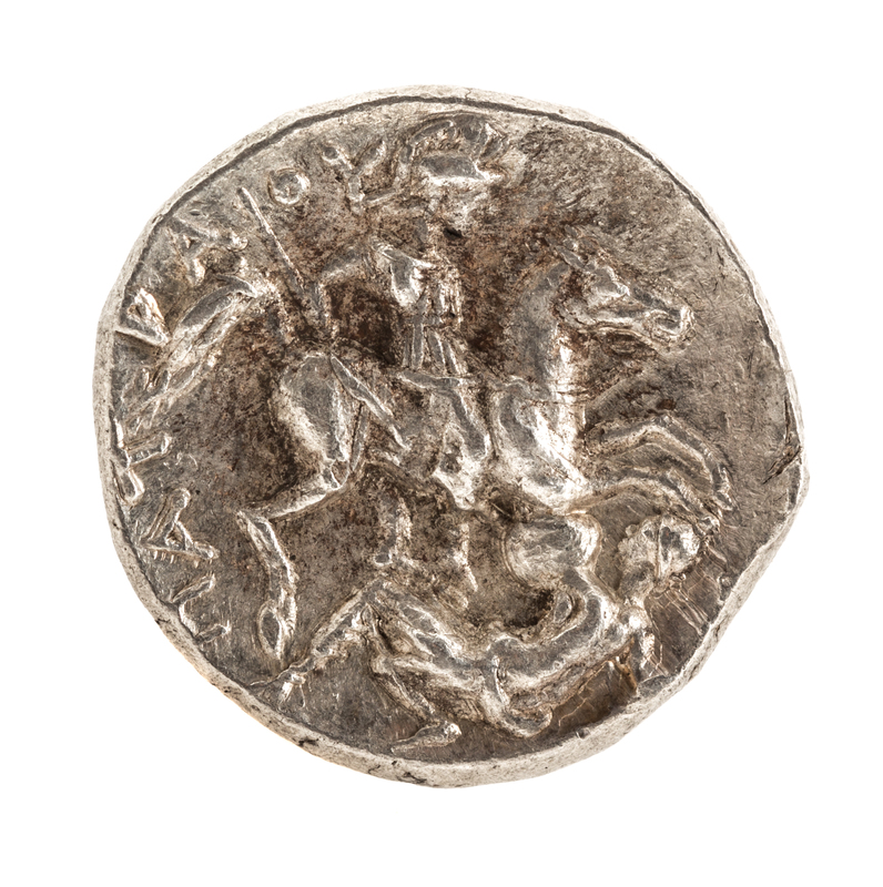 Featuring image of Patraus crowned with laurels on obverse, cavalry slaying an enemy on reverse.