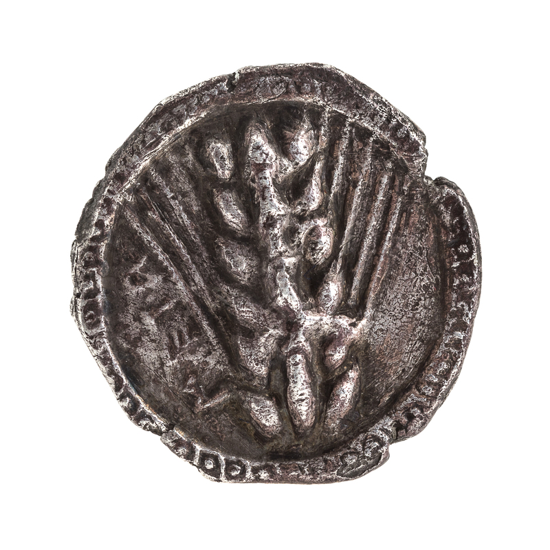 Featuring an ear of barley on the obverse, incuse image on reverse.