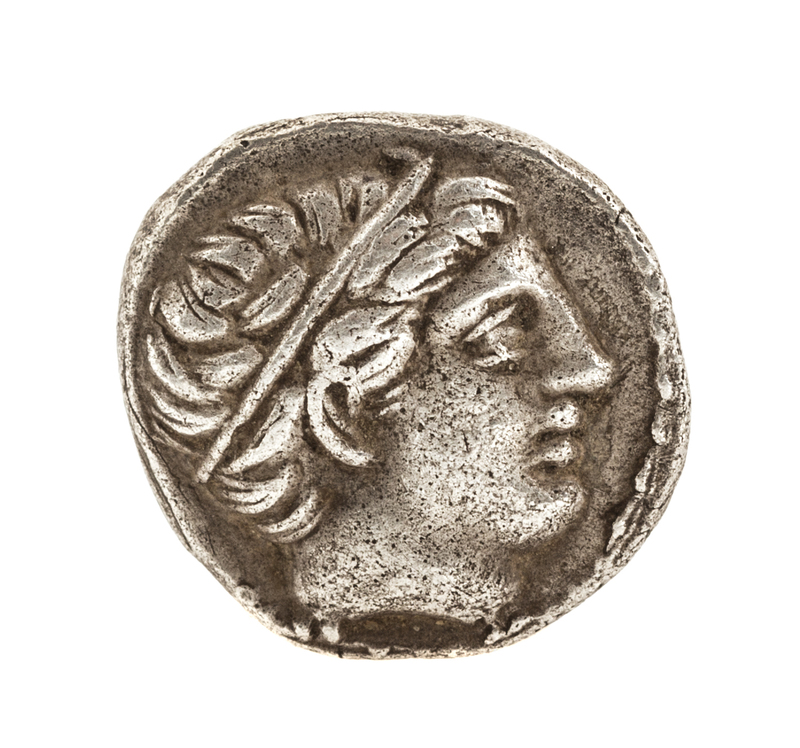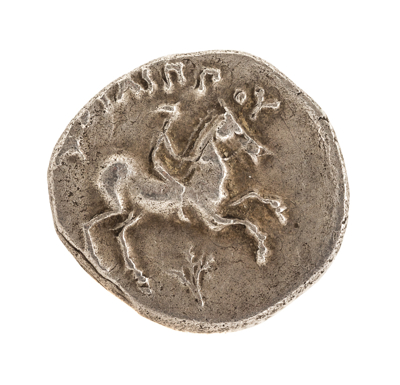 Featuring crowned Apollo on obverse, nude rider on horseback on reverse.