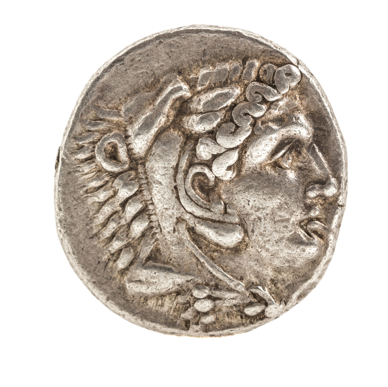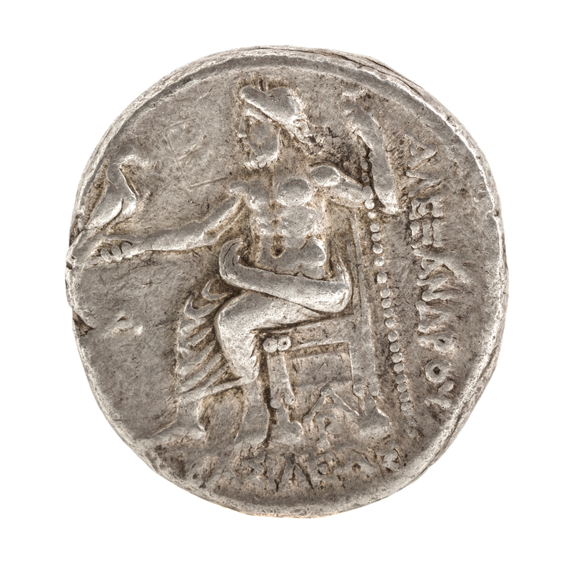 Featuring Alexander the Great as Herakles on obverse, seated Zeus on reverse.