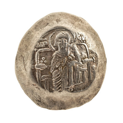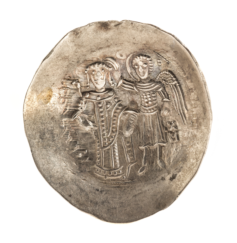 Featuring Isaac II and St. Michael on obverse, enthroned Virgin Mary on reverse.