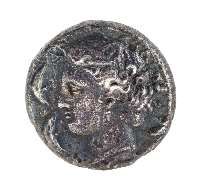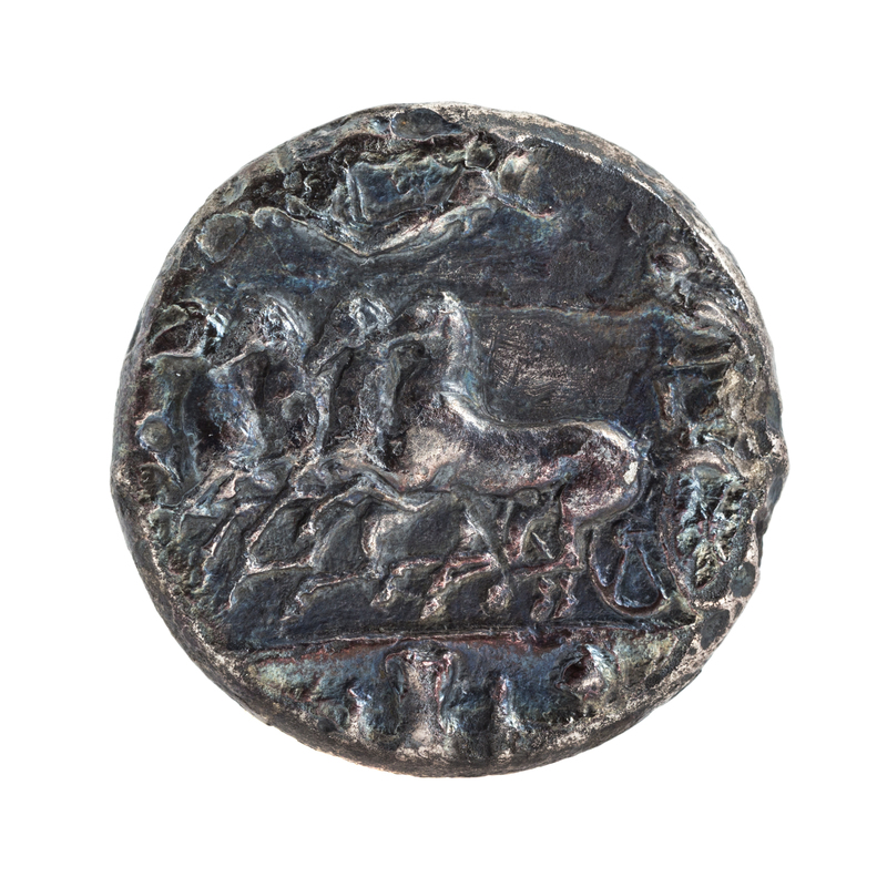 Featuring an image of Arethusa surrounded by dolphins on obverse, charioteer escorted by Nike on reverse.