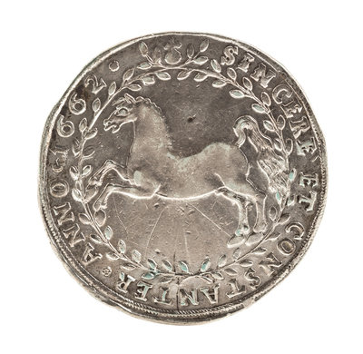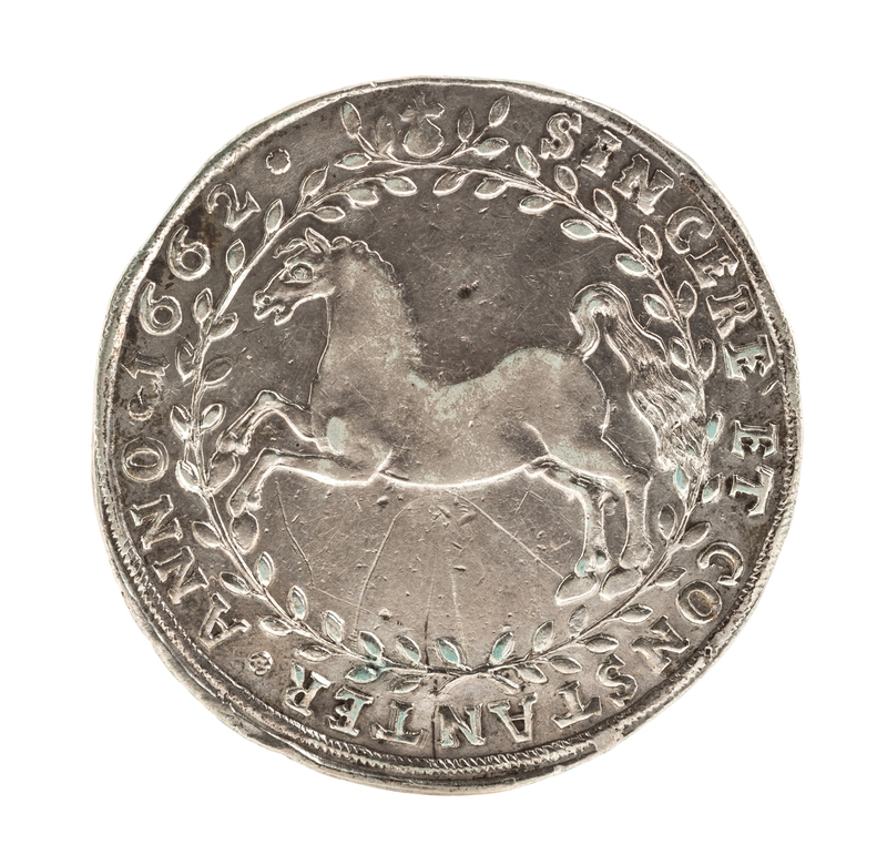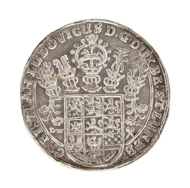 Featuring Duke Christian Louis on obverse, prancing horse on reverse.