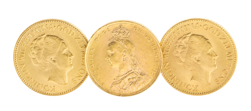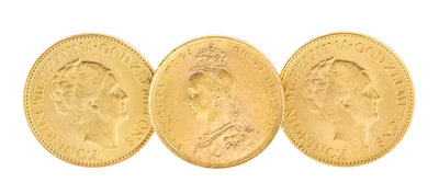Comprising a Victorian Gold Crown-1889 and two Dutch 10 Guilder examples.