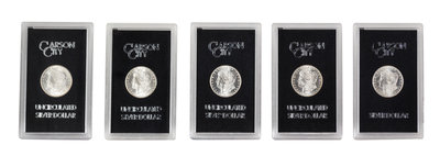 A Collection of Five GSA Carson City Silver Dollars
