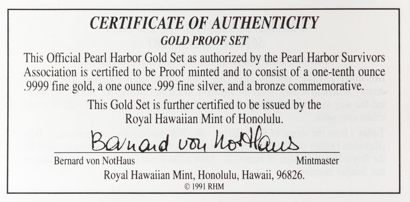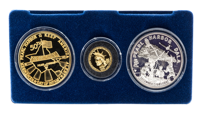 Comprising a 1/10 ounce gold coin, a 1 ounce silver coin and a bronze example.