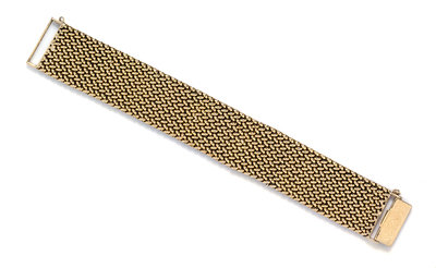 in a mesh style, measuring approximately 25.00 mm wide, the clasp finished in a Florentine texture.Stamp: SEAMAN SCHEPPS 14K.