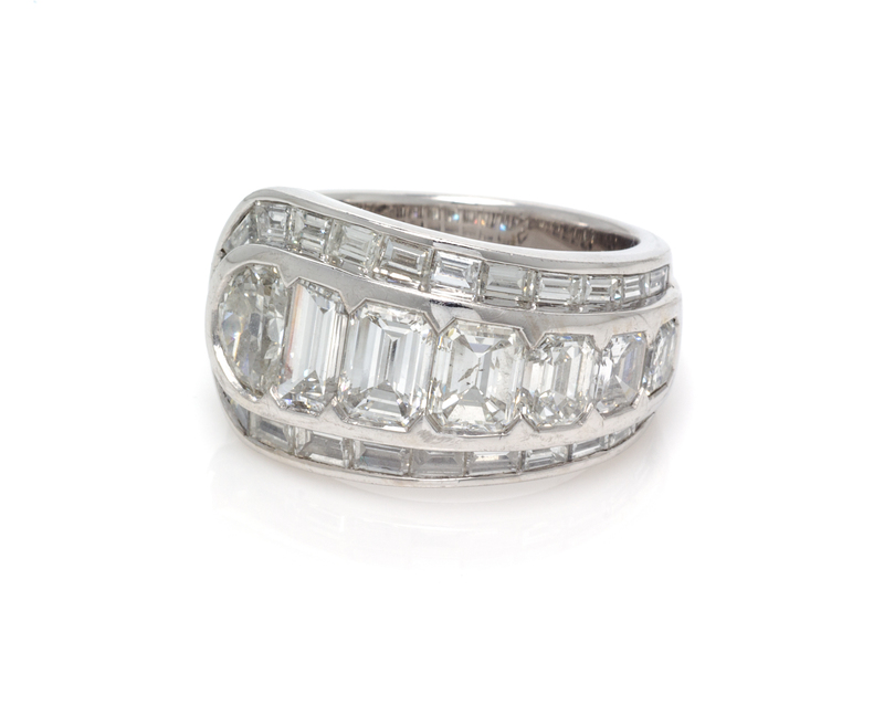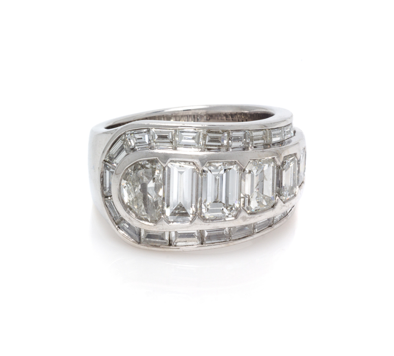containing one antique half moon shape brilliant cut diamond weighing approximately 0.50 carat, six octagonal step cut diamonds weighing approximately 2.20 carats total, and 23 baguette and calibre step cut diamonds weighing approximately 1.04 carats total.
