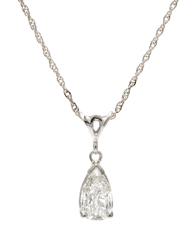 containing one pear shape brilliant diamond weighing approximately 0.78 carat, suspended from a 14 karat chain.