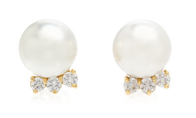 A Pair of 18 Karat Yellow Gold, Cultured Pearl and Diamond Earclips, Gumps,