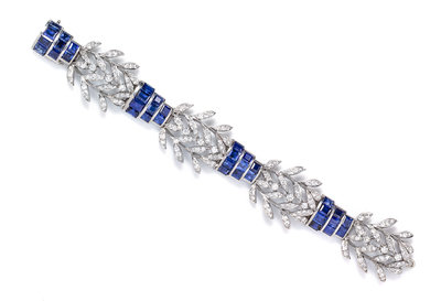 composed of alternating openwork foliate motif links and tiered channel set links, containing numerous round brilliant and single cut diamonds weighing approximately 4.80 carats total, together with 36 rectangular and square step cut sapphires weighing approximately 15.00 carats total.Stamp: SEAMAN SCHEPPS.