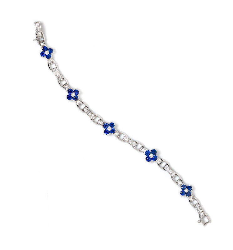 consisting of alternating quatrefoil and bar links, the quatrefoils containing 20 round mixed cut sapphires weighing approximately 5.00 carats total, the centers and bar links containing 33 round brilliant cut diamonds weighing approximately 1.68 carats total. Stamp: 10 IRID 90 PLAT W (Waslikoff maker's mark).