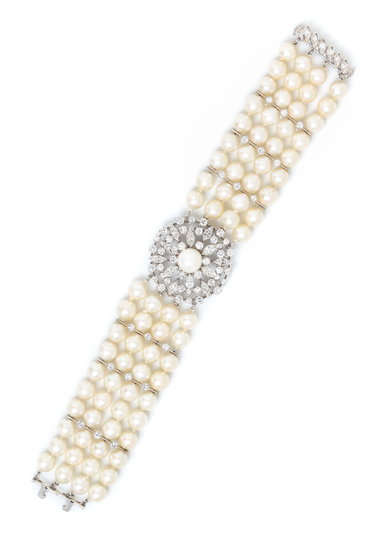 consisting of a central circular section containing one pearl measuring approximately 8.66 mm in diameter and numerous diamonds extending outward in a four row bracelet containing 64 pearls measuring approximately 6.70-6.79 mm in diameter with spacers at regular intervals, the bracelet containing 12 marquise cut diamonds weighing approximately 2.10 carats, and 66 round brilliant cut diamonds weighing approximately 3.40 carats total.