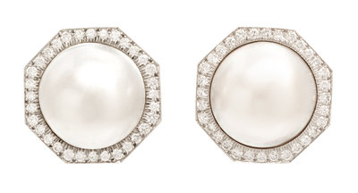 A Pair of Platinum, 18 Karat White Gold, Mabe Pearl and Diamond Earclips, David Webb,
