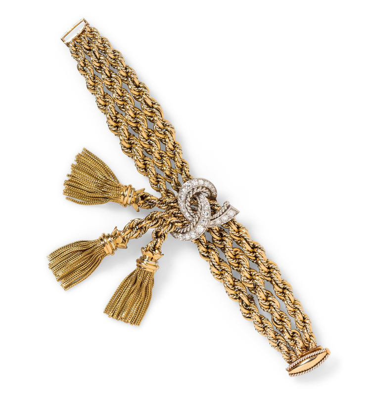 An 18 Karat Yellow Gold, Platinum and Diamond Tassel Bracelet, French,