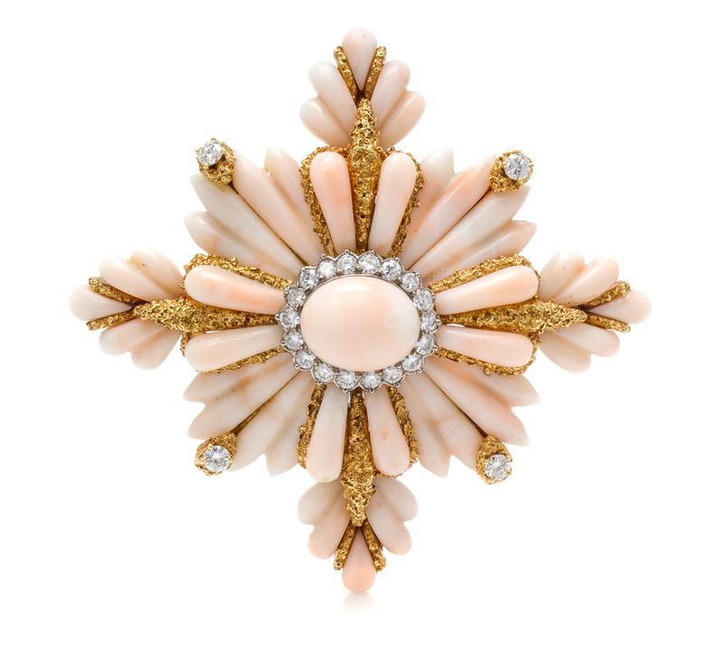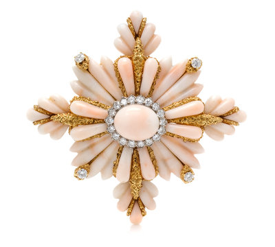 containing a central oval cabochon cut angel skin coral measuring approximately 15.64 x 12.48 mm and numerous angelskin coral sections, together with 22 round brilliant cut diamonds weighing approximately 3.52 carats total, the brooch measures approximately 74.00 x 74.00 mm.Stamp: (WANDER partially obscured) FRANCE.