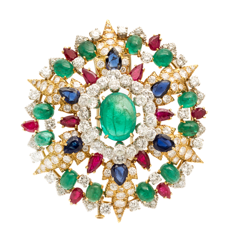 An 18 Karat Yellow Gold, Platinum, Emerald, Ruby, Sapphire and Diamond Pendant/Brooch, David Webb, Circa 1960,