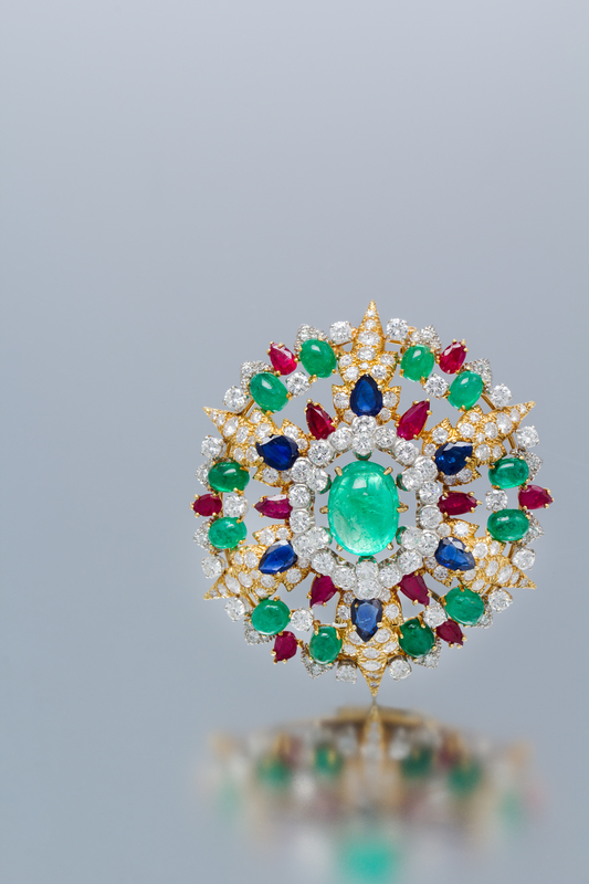 in a circular openwork design, containing one oval cabochon cut emerald measuring approximately 14.20 x 10.86 mm, 12 oval cabochon cut emeralds weighing approximately 9.00 carats total, 12 pear shape mixed rubies weighing approximately 5.10 carats total, six pear shape mixed cut sapphires weighing approximately 3.00 carats total, and 156 round brilliant and single cut diamonds weighing approximately 9.25 carats total.Stamp: 18K WEBB PLAT.