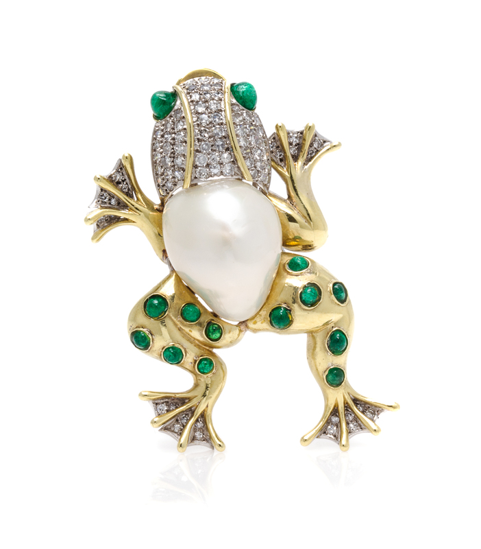 An 18 Karat Two Tone Gold, Cultured Pearl, Diamond and Emerald Frog Brooch, Trio,