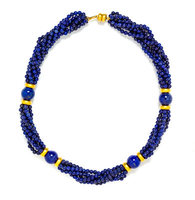 A High Karat Yellow Gold and Lapis Bead Necklace, Neptune,
