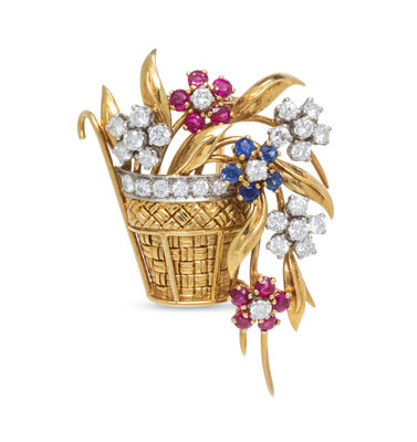 An 18 Karat Yellow Gold, Platinum, Diamond, Ruby and Sapphire Flower Basket Brooch, French,