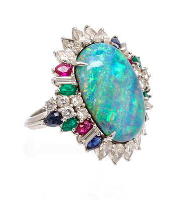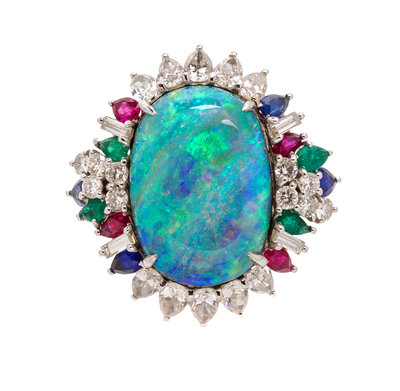 containing one oval cabochon cut boulder opal measuring approximately 20.43 x 14.57 x 6.35 mm, 10 pear shape brilliant cut diamonds weighing approximately 1.50 carats total, 10 round brilliant cut diamonds weighing approximately 0.40 carat total, four baguette cut diamonds weighing approximately 0.20 carat total and 12 pear shape mixed cut emeralds rubies and sapphires.Stamp: 10% IRID PLAT.