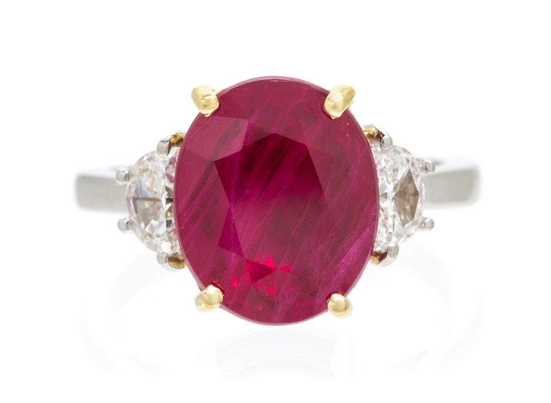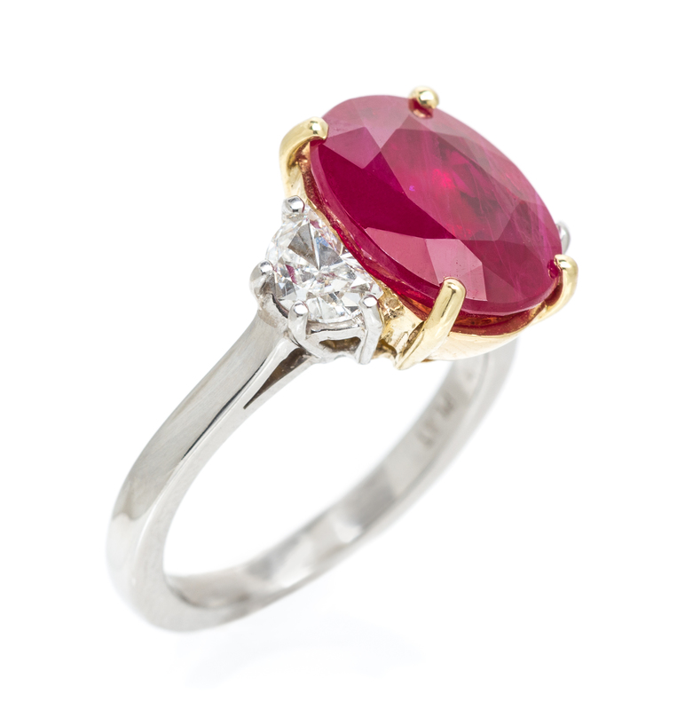 containing one oval shape mixed cut ruby measuring approximately 11.74 x 9.65 x 6.27 mm, and two half moon cut diamonds weighing approximately 0.66 carat total.Stamp: PLAT.
