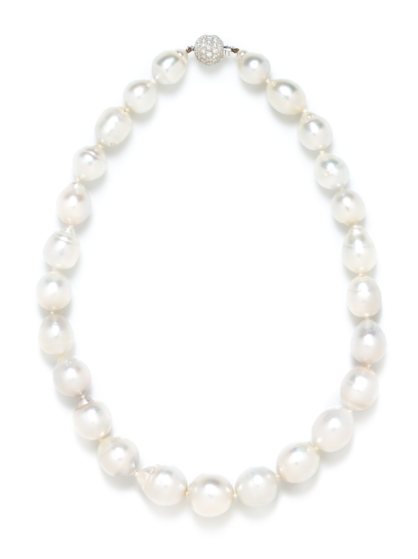containing 25 graduated baroque pearls measuring approximately 11.56-15.87 mm in diameter, the white gold ball clasp containing 95 round brilliant cut diamonds 1.16 carats total.