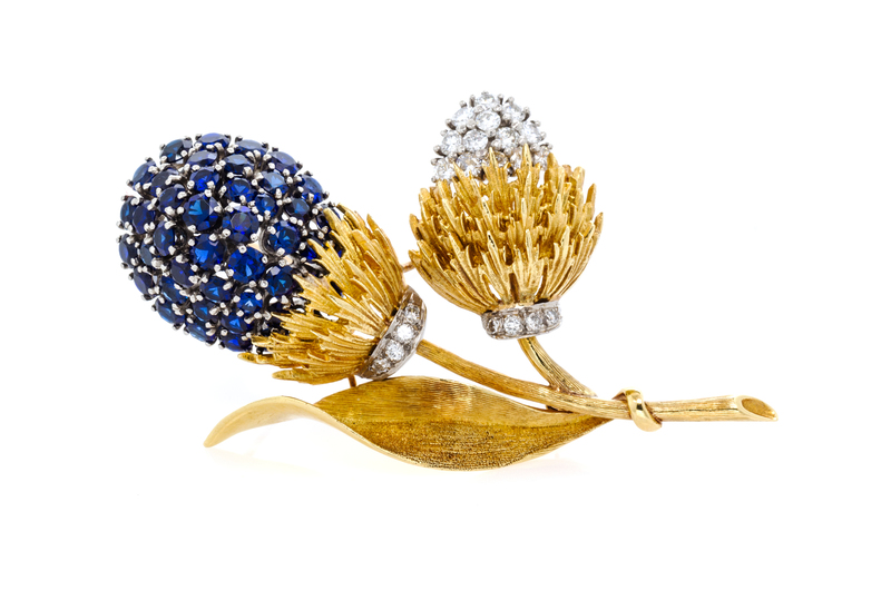 in a thistle motif with a textured gold stem and petals, containing numerous round mixed cut synthetic sapphires, and numerous round brilliant cut diamonds weighing approximately 1.85 carats total.Stamp: E. PEARL 18K.