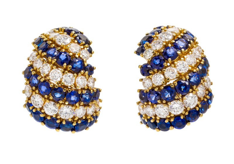 A Pair of 18 Karat Yellow Gold, Diamond and Sapphire Bombe Earclips, Elan,