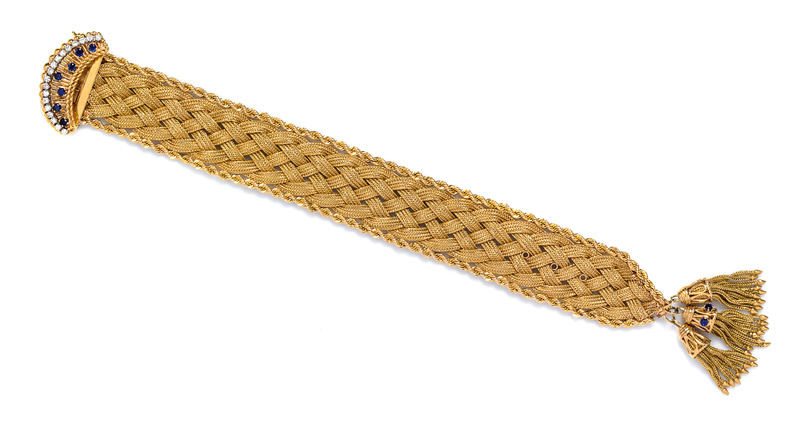 consisting of a braided link bracelet edged in rope chain and measuring approximately 25.00 mm in width with an extended overlay covering containing 18 round brilliant cut diamonds weighing approximately 0.58 carat total and seven round cut sapphires measuring 2.63-2.73 mm in diameter, ending with a fringed tassle containing two round cut sapphires measuring 2.73-2.79 mm in diameter.Stamp: 14K (partially obscured).