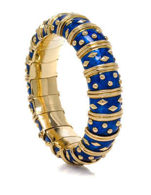a bombe bangle applied with blue paillonne enamel, spaced by ribbed gold bands, the links alternately studded with lozenge shape and dot motif gold accents, measuring approximately 18.60 mm wide.Hand inscribed: TIFFANY (scratch mark 929) SCHLUMBERGER MADE IN FRANCE (French assay and maker's marks).