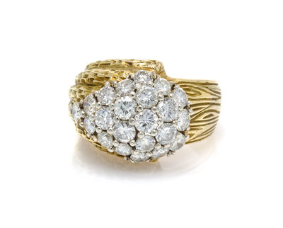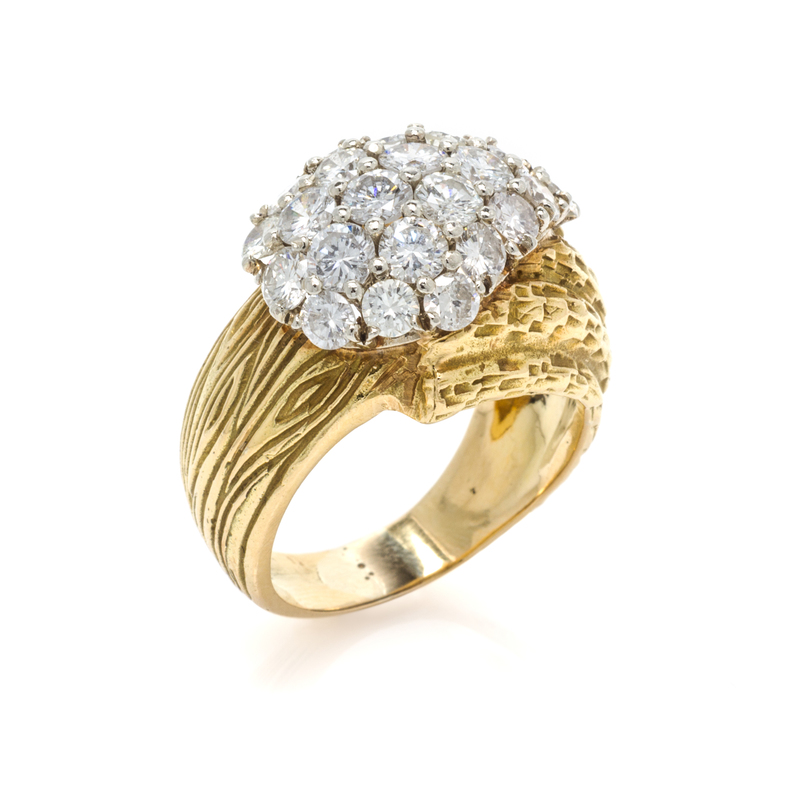 in an asymmetric design, composed of a textured and fluted bark motif ring base surmounted with a cluster setting containing 22 round brilliant cut diamonds weighing approximately 2.25 carats total.Stamp: 18K.