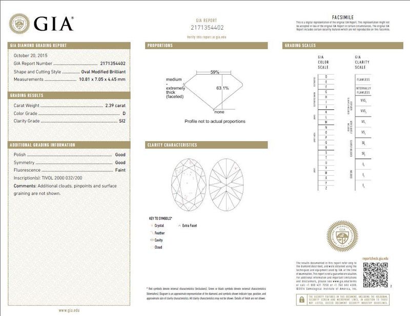 measuring approximately 10.81 x 7.05 x 4.45 mm.Accompanied by a Gemological Institute of America diamond grading certificate number 2171354402, dated October 20, 2015, Color: D, Clarity: SI2, Polish: Good, Symmetry: Good, Fluorescence: Faint, Inscription: TIVOL 2000 032/200.