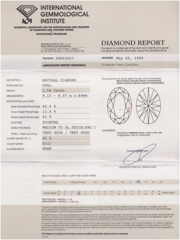 measuring approximately 9.13 x 6.57 x 3.89 mm.Accompanied by a International Gemological Institute diamond grading certificate number F2H33527, dated May 25, 1999, Color: G, Clarity: SI2, Polish: Very Good, Symmetry: Very Good, Fluorescence: None.