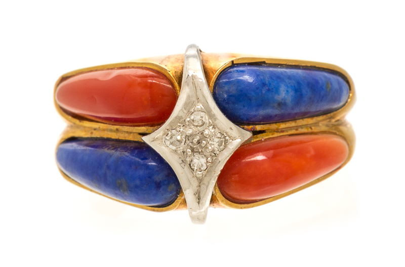 A Yellow Gold, Coral, Lapis Lazuli and Diamond Ring,