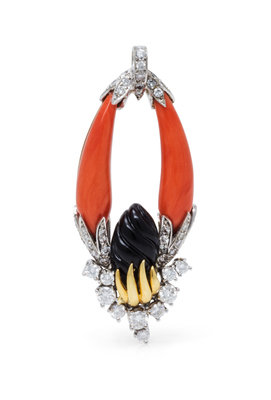 An 18 Karat Yellow Gold, Platinum, Coral, Onyx and Diamond Pendant, Kutchinsky,