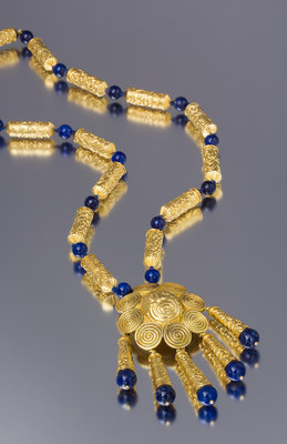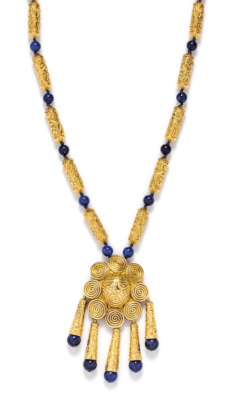 consisting of a circular pendant in a Mesoamerican motif supporting a fringe of five textured gold and lapis lazuli drops, the pendant suspended from a back chain composed of textured barrel shape gold links strung knotted alternating with 21 lapis beads measuring approximately 8.00 mm in diameter, hidden clasp.Stamp: VCA NY 4V408 1 18K.